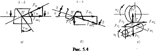 В плоскости зацепления b – b (рис. 5.4, а) на витки червяка и зубья колеса действует нормальная сила Fn.
