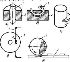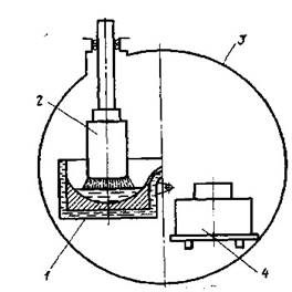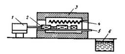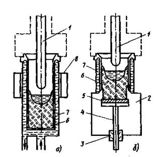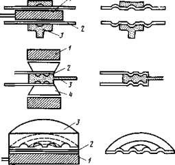 Кроме рассмотренных установок с непосредственным воздействием рабочей среды на заготовку существуют устройства, в которых деформация заготовки производится посредством промежуточного звена (рис. 16.4). Под действием давления, возникающего в верхней части матрицы 2, пуансон 4 движется вниз и придает заготовке 5 необходимую форму.