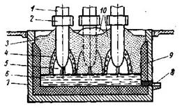 Очистка литья. Очистка литья от формовочной земли производится в воде и полностью исключает пылеобразование. При этом методе очищаемые отливки помещают в бак. После установки электродов относительно деталей последние очищаются от формовочной земли серией импульсов. Применение многоэлектродных трехфазных установок позволяет производить обработку сразу нескольких отливок, устанавливаемых относительно электродов в произвольном положении.
