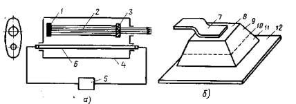 Для получения различных по форме изделий создаются различные формы волн: с острым фронтом, сферические и др. Это достигается различным расположением электродов, а также различными формами проволочек, закорачивающих межэлектродный промежуток. Схема электрогидравлической штамповки детали показана на рис. 16.3. Листовую заготовку 2 укладывают на матрицу/и прижимают к ней с помощью прижимных устройств. Над заготовкой расположена жидкая передающая среда 4, в которой на определенном расстоянии от заготовки размещены положительный и отрицательный электроды 5, соединенные с генератором импульсов тока электрогидравлической установки.