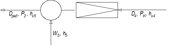 Расход редуцированного пара Dред c параметрами Р2 = 0,12 МПа, х = 0,96 … 0,98 и hx 5 , кДж/кг и охлаждающей воды W5 , кг/с, определяют из уравнения теплового и материального балансов: