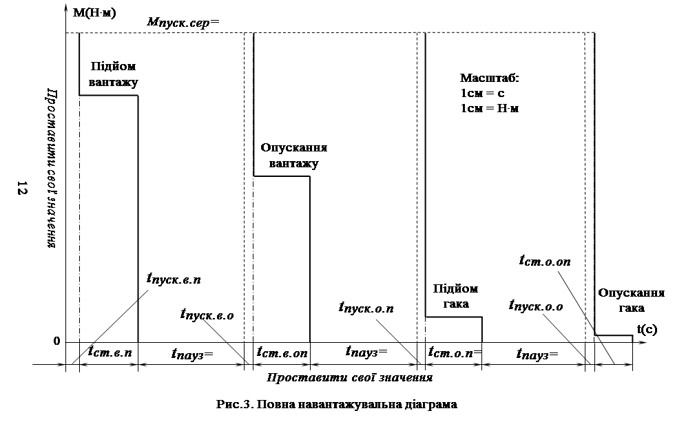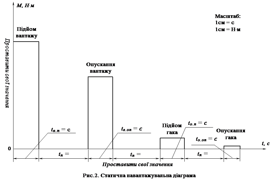 На першому етапі розрахунку слід побудувати в масштабі статичну (без урахування динамічних навантажень) навантажувальну діаграму механізму підйому, беручи до уваги розрахункову тривалість робочих операцій (рис. 2).
