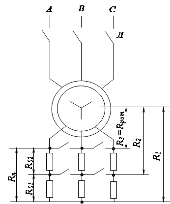 Пускові резистори вмикаються у кожну фазу ротора АД (рис. 3). Зазвичай повний опір пускових резисторів Rп розбивається на секції, кількість яких відповідає кількості штучних механічних характеристик.