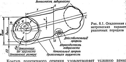 При анализе точности геометрических параметров деталей различают поверхности: номинальные (идеальные, не имеющие отклонений формы и размеров), форма которых задана чертежом, реальные (действительные), которые ограничивают деталь, отделяя ее от окружающей среды. Реальные поверхности деталей получают в результате обработки или видоизменения при эксплуатации машин. Аналогично следует различать номинальный и реальный профиль, номинальное и реальное расположение поверхности (профиля). Номинальное расположение поверхности определяется номинальными линейными и угловыми размерами между ними и базами или между рассматриваемыми поверхностями, если базы не даны. Реальное расположение поверхности (профиля) определяется действительными линейными и угловыми размерами. База - поверхность, линия, точка детали (или выполняющее ту же функцию их сочетание), определяющие одну из плоскостей или осей системы координат, по отношению к которой задается допуск расположения или определяется отклонение расположения. Профиль поверхности - линия пересечения (или контур) поверхности с плоскостью или заданной поверхностью. Реальные поверхности и профили отличаются от номинальных.