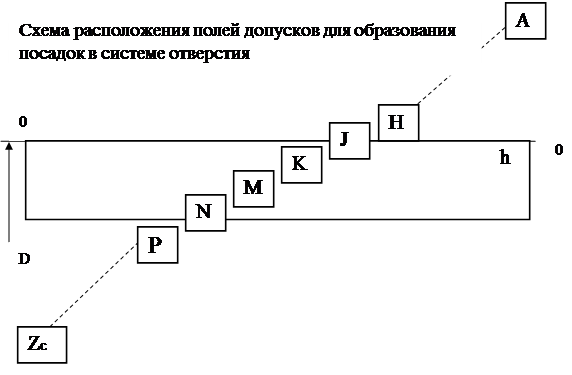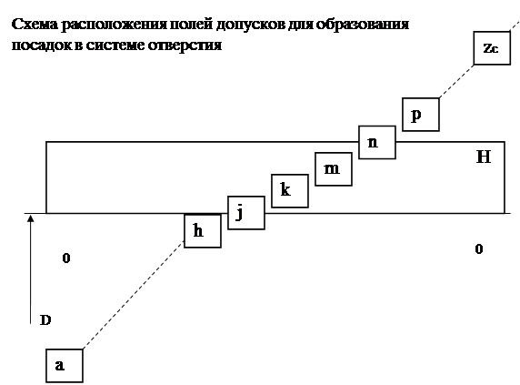 Посадки в системе отверстия - посадки, в которых различные зазоры и натяги получаются соединением различных валов с основным отверстием (рис. 1.3, а), которое обозначают Н. Для всех посадок в системе отверстия нижнее отклонение отверстия ЕI = О, т. е. нижняя граница поля допуска основного отверстия, всегда совпадает с нулевой линией. Поле допуска основного отверстия откладывают вверх.