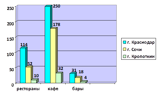 В России ресторанный бизнес занимает лидирующее место. В отдельных регионах страны с каждым годом увеличивается количество предприятий общественного питания. Краснодарский край – один из самых быстроразвивающихся регионов России. Общая численность населения края составляет 5125221 человек, из них городского населения – 2730544 человек, сельского населения – 2384677 человек. Здесь много курортных зон, поэтому в крае появляется всё больше предприятий питания. Множество отдыхающих и туристов привлекает не только теплый морской климат побережья, приятная атмосфера, но и кубанская кухня. Чтобы рассмотреть динамику развития общественного питания в Краснодарском крае необходимо более подробно разобрать ресторанный бизнес некоторых городов нашего региона, поэтому стоит обратить внимание на следующие населенные пункты: Краснодар, Сочи и Кропоткин. Город Краснодар – центр Краснодарского края с самым большим населением, развитие промышленности, общественного питания наиболее динамичное по сравнению с другими территориями края. Сочи – один из лучших курортов не только Кубани, но и всей России, количество отдыхающих с каждым годом увеличивается в 10 раз. В связи с этим в городе открывается большое количество предприятий общественного питания разных типов и классов. Кропоткин – малоразвитый город в отношении ресторанного бизнеса, здесь больший сегмент рынка занимает промышленность и сельское хозяйство.