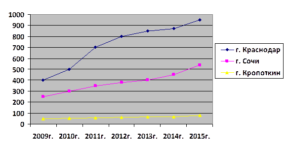 Чтобы удостовериться в правильности выводов можно посмотреть на динамику развития ресторанного бизнеса в Сочи, Кропоткине и Краснодаре (рис. 15).