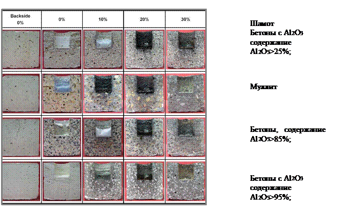 Исследование подтверждает, что продукты с содержанием глинозема:> 25% и > 85% требует, что дополнение их карбидом кремния улучшает их стойкость. Маленькие трещины видимы на задней стороне испытуемого тигля. Ситуация изменяется при в более высокой температуре, которая имеется в камере сгорания, у входного кольца , своде головки печи, фурме горелки или в горячей зоне холодильника. При более высокой температуре содержание карбида кремния в огнеупорном бетоне имеет положительное значение.В бетонах на основе шамота небольшое добавление 5-10% карбида кремния создает положительный эффект. Подобная ситуация появляется в бетонах на основе муллита и более высоко глиноземестом материале. Это было также доказано в практике, что продукты, содержащие между 5-15% из карбида кремния представляют превосходные показатели по сопротивлению щелочной коррозии и абразивному воздействию.