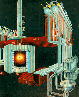 Реакторы с водой под давлением называются иначе водоводяными или легководными. Они выполняются в виде цилиндрического сосуда высокого давления со сьемной крышкой. В этом сосуде (корпусе реактора) размещается активная зона, составленная из топливных сборок (топливных кассет) и подвижных элементов системы управления и защиты. Вода входит через патрубки в корпус, подается в пространство под активной зоной, двигается вертикально вверх вдоль топливных элементов и отводится через выходные патрубки в контур циркуляции. Тепло ядерных реакций передается в парогенераторах воде второго контура, более низкого давления. Движение воды по контуру обеспечивается работой циркуляционных насосов, либо, как в реакторах для станций теплоснабжения , - за счет движущего напора естественной циркуляции.
