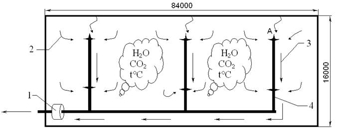 1 ― вентилятор типа ОВ; 2 ― удаляемый воздух; 3 ― направление движения удаляемого воздуха внутри вытяжных каналов; 4 ― вытяжные каналы.