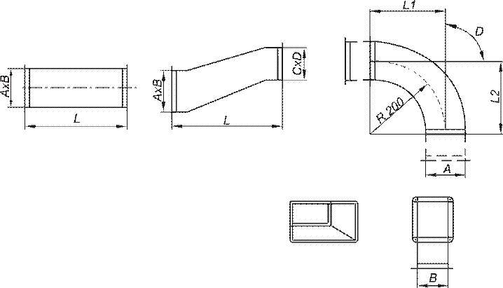 Сеть воздуховодов компонуется из унифицированных деталей: прямых участков, переходов, отводов, тройников, крестовин и заглушек. Следует применять воздуховоды размерами наружных сечений: