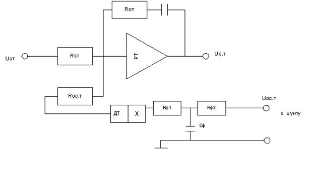 Для исключения влияния пульсирующего характера тока и напряжения снимаемых с шунта, на вход датчика тока нужно установить фильтр. Принимаем Rф =10 Ом; Тф =0,006 с. Сф =Тф /Rф =600 мкФ.