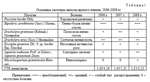Необходимо отметить и первое обнаружение ринхоспориоза на листьях ярового ячменя в 2008 году. В целом, анализ распространения листовых болезней на яровом ячмене показал, что доминирующим комплексом патогенных микромицетов являлась группа типичных некротрофов, относящихся к почвенно-семенным инфекциям с выраженной К-стратегией, тогда как биотрофы (Puccinia hordei, Erysiphe graminis DC. f. sp. hordei) развивались на слабом уровне.