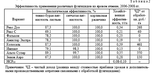 Результаты комплексной оценки эффективности применения различных фунгицидов на яровом ячмене приведены в таблице 2.
