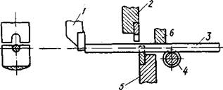 Схема резки штанг на сортовых ножницах приведена на рис.. Нижний нож 5 крепится к станине, верхний 2 — к ползуну, перемещающемуся в направляющих. Разрезаемая штанга 3 укладывается на ролик 4 и подается вручную или механически вперед до упора 1. Прижим 6 обеспечивает неподвижность положения штанги 3 в момент резки. При рабочем ходе ползуна ножниц верхний нож 2, имеющий режущую кромку соответствующей формы, разрезает пруток.