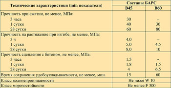 В НИИЖБ выполнен комплекс исследований для оценки технических свойств материалов типа «БАРС» и определения областей их применения. Следует отметить, что существующая практика ремонтных и реставрационных работ не предъявляет нормативных требований к ремонтным материалам.