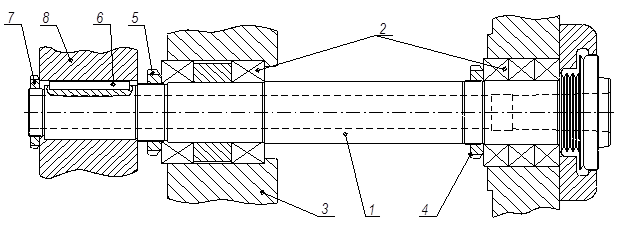 На рисунке 1.1 представлен фрагмент шпиндельного узла токарного станка. На шпиндель 1 напрессованы подшипники качения 2, которые в свою очередь, запрессованы в переднюю бабку 3. Натяг подшипников осуществляется стопорными гайками 4 и 5. С помощью шпонки 6 и стопорной гайки 7 на конце шпинделя 1 устанавливается шкив 8.