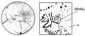Структура сплава АМц состоит из a -твердого раствора марганца в алюминии и вторичных выделений фазы MnAl6 (рис. 3). В присутствии железа вместо MnAl6 образуется сложная фаза (MnFe)Al6 , практически нерастворимая в алюминии, поэтому сплав АМц и не упрочняется термической обработкой.