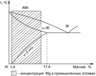 Сплавы АМг (магналий) относятся к системе А1 – Mg (рис. 4). Магний образует с алюминием a -твердый раствор и в области концентраций от 1,4 до 17,4 %Mg происходит выделение вторичной b -фазы (MgAl), но сплавы содержащие до 7 %Mg, дают очень незначительное упрочнение при термической обработке, поэтому их упрочняют пластической деформацией – нагартовкой.