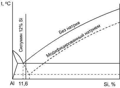 Характерным представителем алюминиевых литейных сплавов являются силумины – это сплавы алюминия с кремнием, обычно содержащие 10 – 13 %Si (AK12) (рис. 7).