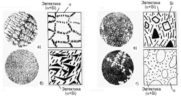 Микроструктура литых доэвтектических силуминов состоит из светлых дендритов a - твердого pacтворa кремния в алюминии и двойной эвтектики a + Si игольчатого типа, рис. 8в (т.к. растворимость Al в Si при комнатной температуре составляет 0,05 % , допустимо считать, что в структуре сплавов при низких температурах присутствует не b -твердый раствор, а кремний).