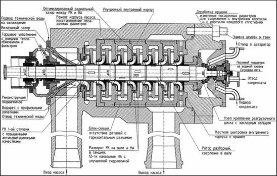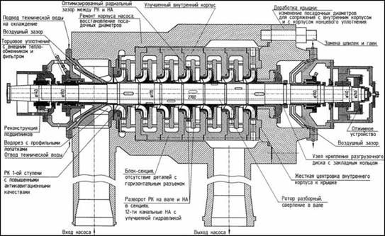 При реконструкции питательного насоса ПН 1500-350-4 внедрен пусковой подшипник, работающий на воде, укорочен вал, снижен прогиб ротора. Изменено соотношение количества лопастей рабочего колеса и лопаток направляющего аппарата до соотношения 7/12. Секции направляющего аппарата выполнены в виде неразборных блок-секций, ротор выполнен разборным, рабочие колеса посажены на вал по переходной посадке.