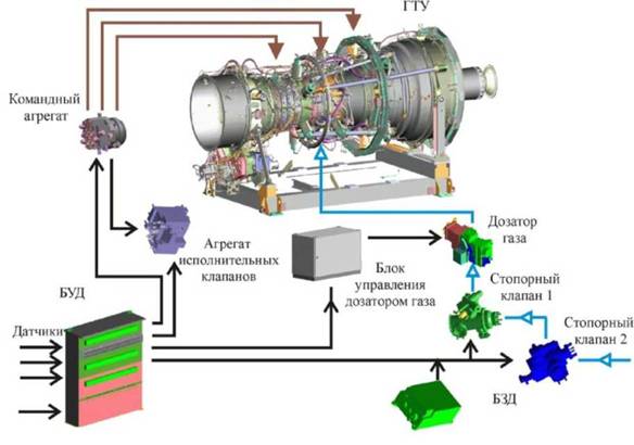При этом в состав САУ ГТУ не входят агрегаты, обеспечивающие подачу и дозирование газообразного топлива (СК1, СК2, дозатор газа, блок управления дозатором газа).