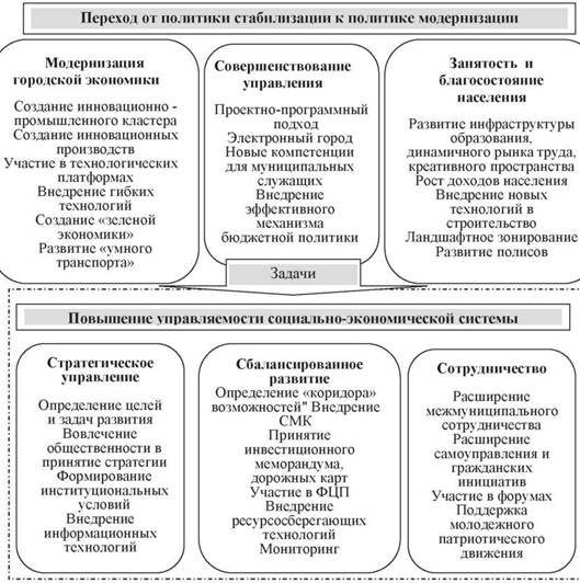 Посткризисное развитие позиционирует стратегическое управление средних городов в роли «экономического интегратора», то есть инициатора и модератора целенаправленного воздействия на экономику с целью перевода ее на траекторию инновационного развития на основе использования программно-проектных методов, технологического форсайта.