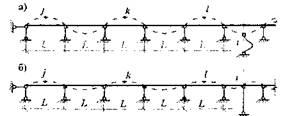 а - перемещения /-го сечения в пролете, где становлено устройство гашения; б - перемещения j'-го, fr-ro, г-го сечений (см. рис.2);