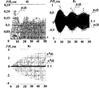 На рис. Зв приведено сравнение осциллограмм перемещений в базовой модели газопровода (у,°(0) и в модели с устройством гашения (у,(У)). Видно, что резонансные амплитуды в системе, где нет устройства гашения колебаний, непрерывно возрастают с течением времени. Включение односторонней связи в работу значительно снижает резонансные амплитуды, что свидетельствует об устойчивом характере колебаний. Так, для г-го сечения модели отношение максимальных резонансных амплитуд составило (t =50 с= 3,43/0,22 = 15,88.