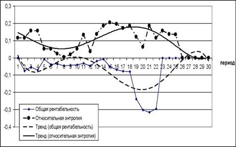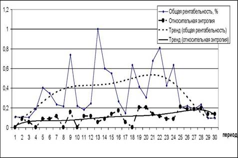 Динамика относительной энтропии представлена на рис. 1 и 2. С целью лучшей визуализации, на графике изображены нормированные значения общей рентабельности. Аппроксимация кривых проводилась полиномами пятой степени. Кроме непосредственных оценок энтропии, в качестве информационных характеристик, рассчитывались показатели, производные от нее. Так для измерения абсолютной организации системы использовалась разность Hmax - H. Относительная организованность системы оценивалась по формуле: