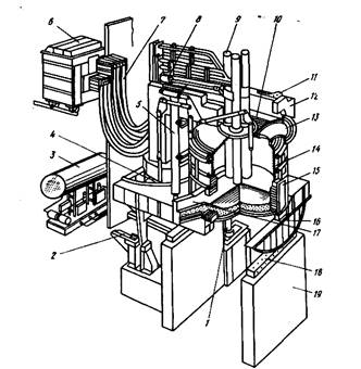 Рис. 1. 1 – механизм наклона печи; 2 – фиксатор; 3 – насосно-аккумуляторная станция; 4 – механизм поворота портала; 5 – механизм перемещения электродов; 6 – печной трансформатор; 7 – вторичный токоподвод; 8 – электрододержатель; 9 – графитированный электрод; 10 – свод водоохлаждаемый; 11 – механизм подъема свода; 12 – полупортал; 13 – патрубок газоотсоса сводовый; 14 – стеновые водоохлаждаемые панели; 15 – корпус печи; 16 – люлька; 17 – сливной носок; 18 – фундаментная балка; 19 – фундамент.