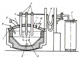 Рис. 8. Основные элементы комплекса ДСП: 1 - свод; 2 - рабочее окно; 3 - сталевыпускное отверстие; 4 - электроды; 5 - электрододержатели; 6 -короткая сеть; 7 - трансформатор; 8 - кислородная фурма; 9 - отвод отходящих газов; 10 - загрузочная воронка; 11 – шомпольный термозонд.