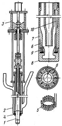 Шомпол 1охлаждается водой, поступающей к его штецерам по гибким шлангам. Чувствительным элементом шомпола служит дифференциальная батарея миниатюрных хромель-алюмелевых термопар 5, горячие и холодные спаи которых расположены на разных расстояниях от наружной поверхности шомпола в глухих концах соответственно наклонных и прямых отверстий 6, высверленных с торца термоцилиндра 7 по всей его окружности. Таким образом, термобатарея фиксирует температурный перепад по толщине цилиндрической стенки термоцилиндра между заданными ее сечениями. Этот перепад температуры ∆t определяется удельным тепловым потоком, проходящим через стенку теплоприемника, который в свою очередь связан с величиной падающего теплового потока. Торец термоцилиндра 7 закрыт медным наконечником 8, наружный буртик которого защищает кольцевой паз 9, соединяющий все отверстия 6 с трубками 10, служащими для выводаконцов термобатареи.