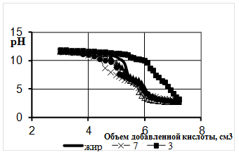 Анализируя варианты введения ферментных препаратов в раствор, можно сделать вывод о том, что совместное использование липазы флюозим ГЗх и протеазы Прок возможно лишь при условии их поочередного введения. Данные таблицы 2 показывают также, что введение в субстрат липазы флюозим ГЗх, а затем протеазы Прок приводит к значительному снижению протеолитической активности полиферментной системы, что может объяснятся особенностями механизма каталитической реакции, при которой флюозим ГЗх, воздействуя на субстрат, затрудняет каталитическое действие протеазы Прок.