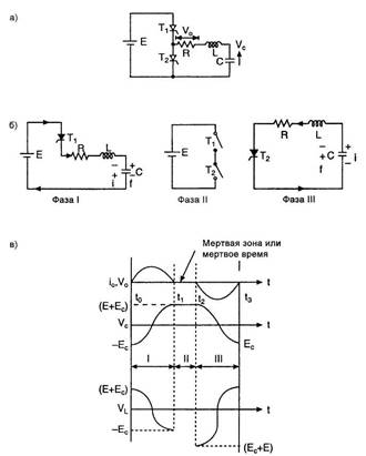 Фаза I . Тиристор Т1 включается в момент времени to . Начинается заряд конденсатора от источника питания. Последовательная цепь R , L и С формирует синусоидальный ток через нагрузочное сопротивление и выполняет функцию демпфирующей цепи. Когда ток в цепи уменьшается до нуля, тиристор Т1 запирается. Напряжение на нагрузочном сопротивлении находится в фазе с током тиристора. Формы напряжений VL и Vc можно получить с помощью теоремы Кирхгофа: ( VL + Vc = E ), величины VL и Vc должны удовлетворять условиям этого уравнения.