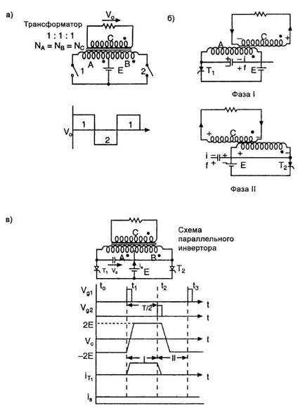 Электрическая схема, рабочие фазы и формы выходных сигналов параллельного инвертора изображены на рис.2. Параллельные инверторы применяются в низкочастотных устройствах. В них используются трансформатор с отводом из центра первичной обмотки, два тиристора и коммутирующий конденсатор. Источник питания включается между центральным выводом и общей точкой катодов тиристоров. Эквивалентное нагрузочное сопротивление, пересчитанное в цепь первичной обмотки, подключено параллельно коммутационному конденсатору. Следовательно, инвертор такого типа является параллельным.