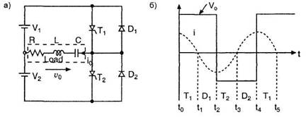 Электрическая схема и форма выходного сигнала однофазного полумостового инвертора с RLС-нагрузкой изображены на рис.5. Если инвертор питает RLС-нагрузку, отдельная цепь коммутирования не требуется. Это можно объяснить с помощью символического изображения на рис.5б. Рабочая частота инвертора должна быть выбрана такой, чтобы Хс > XL . При этих условиях в этой схеме ток опережает по фазе напряжение. Ток в нагрузке изменяется синусоидально. В промежутке времени от t 0 до tl тиристор Т1 находится в проводящем состоянии. В момент времени t 1 = t 2 тиристор Т1 , выключается, так как ток в цепи уменьшается до нуля. В промежутке времени от t 1 до t 2 диод D 1 находится в проводящем состоянии и мощность передается от нагрузки к источнику питания. Диод D 1 находится в проводящем состоянии до тех пор, пока на конденсаторе присутствует напряжение. Когда диод D 1 находится в состоянии проводимости, тиристор Т1 смещен в обратном направлении. Таким образом, специальная цепь принудительной коммутации в этом случае не требуется. В этой схеме RLC-нагрузка обеспечивает коммутацию тиристоров. В течение отрицательного полупериода тиристор Т2 находится в проводящем состоянии, через некоторое время диод D 2 начинает проводить, вследствие этого тиристор Т2 смещается в обратном направлении и запирается.