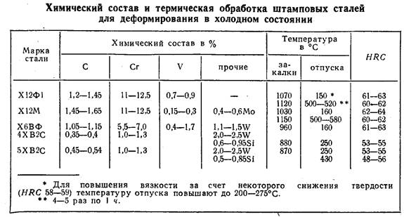 Вытяжные штампы, подвергающиеся интенсивному износу без динамических нагрузок (после неполной закалки отпускают при 150–180°С) имеют твердость HRC 58–61. Высадочные штампы и пуансоны, работающие с ударными нагрузками (подвергают отпуску при 275–325° С) имеют твердость HRC 54–56 в рабочей части.