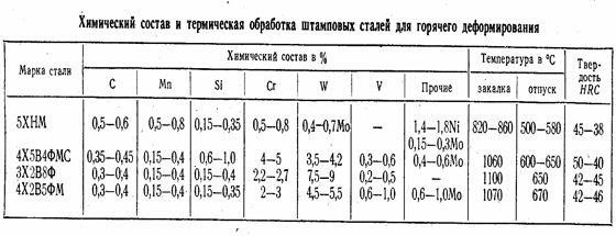 Присутствие в стали молибдена или вольфрама (5ХНВ) повышает теплостойкость, прокаливаемость и уменьшает склонность к обратимой отпускной хрупкости. Сталь 5ХНМ прокаливается полностью в блоке 400x300x300 мм. Закалка штампов производится в масле. Отпуск крупных штампов проводится при температуре 550–580°С (HRC35–38), а мелкие при 500–540° С (HRC40–45).