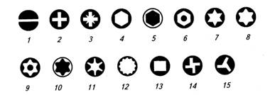 1 - шлиц; 2 - крест; 3 - двойной крест; 4 - внутренний шестигранник; 5 - наружный шестигранник; 6 - шестигранник с центрирующим штифтом; 7 - звезда; 8 - звезда овальная; 9 - звезда с центрирующим штифтом; 10 - звезда наружная; 11 - шлицевая звезда; 12 - внутренний многогранник; 13 - квадрат внутренний; 14 - смещенный крест; 15 - тройной шлиц