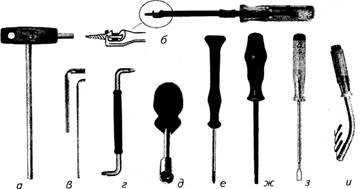 а - с Т-образной ручкой; б - с приспособлением для удержания крепежа; в _ угловые, стандартная и удлиненная; г - двусторонняя угловая; д - для крепежа с внешним шестигранником; е - «часовая»; ж - электроизолированная; з - индикаторная для напряжения 100-500 В; и – с гибким стержнем