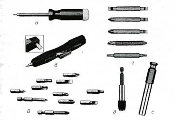 Рис. 8. Отвертки со сменными насадками и принадлежности к ним: а - отвертка с магазином для насадок под крышкой ручки; б - отвертка с «ящичком» в ручке; в - отверточные насадки с одним рабочим профилем; г - насадки с двумя рабочими профилями; д - адаптер для насадок со сдвижной головкой; е - магнитный адаптер