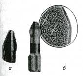 Для передачи повышенного усилия на крепеж увеличивают коэффициент трения между наконечником отвертки и крепежным элементом. Например, формированием насечек на рабочих поверхностях (рис 9, а) или напылением карбида вольфрама или алмаза (рис 9, б). Наносят насечки с помощью лазера, что одновременно повышает твердость наконечников.