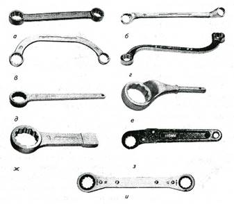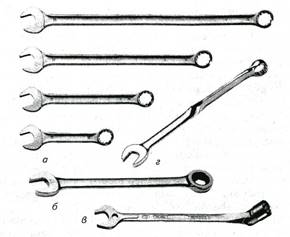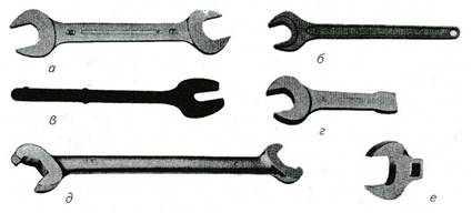 Рис. 15. Разводные гаечные ключи: а - рожковый; б - односторонний накидной; в - двусторонний накидной а б в