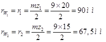 - Радіусами rw1 і rw2 проводимо початкові окружності коліс. Крапка P торкання їх є полюсом зачеплення;