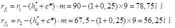 профіль ніжки зуба, що лежить усередині основної окружності, окреслюється по радіальній прямій, що з'єднує початок евоволенти з початком колеса, і сполучається з окружністю западин закругленням радіуса ρ=0,4m=0,4×9=3,6 мм по початковій окружності відкладаємо половину товщини зуба