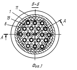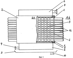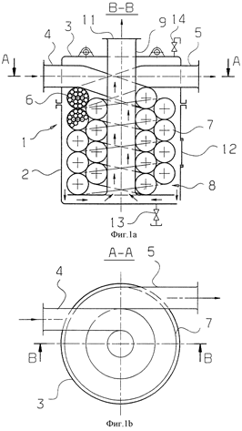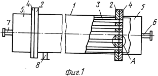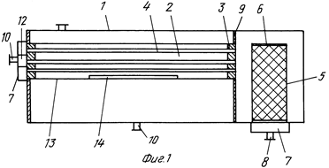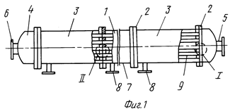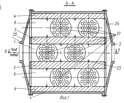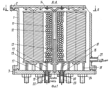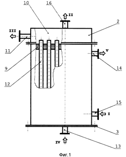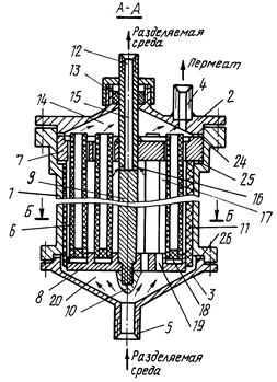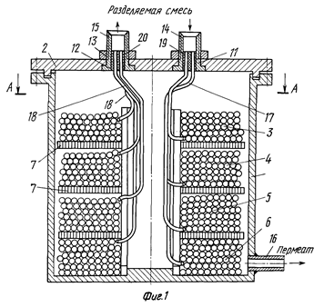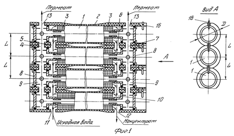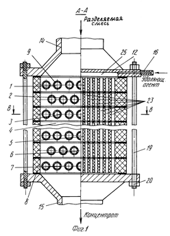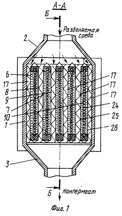 Мембранный аппарат трубчатого типа предназначен для разделения жидких и газовых сред и обеспечивает повышение надежности и упрощение эксплуатации. Мембранный аппарат состоит из цилиндрического корпуса и пучка трубчатых мембранных элементов, одни концы которых закреплены в опорной трубной решетке, а другие (заглушенные) - зафиксированы в распределительной трубной решетке, двух торцевых крышек со штуцерами для подачи разделяемой среды и отвода пермеата и уплотнительных элементов. Обе трубные решетки жестко соединены между собой опорным стержнем, воспринимающим нагрузки, воздействующие на пучок мембранных элементов при сборке (разборке) аппарата и регенерации мембранных элементов вне аппарата. Простота введения в корпус и фиксации в нем пучка мембранных элементов упрощает установку (снятие) мембранных элементов и снижает вероятность повреждения элементов, мест их закрепления в опорной трубной решетке и селективных слоев. Наличие и выполнение соответствующим образом центрального и периферийного обтекателей, а также равномерное расположение каналов для подачи разделяемого потока вокруг каждого мембранного элемента обеспечивает оптимальное распределение потока относительно всех мембранных элементов. Минимальное число уплотнительных элементов и размещение их в замке (пазу) повышает герметичность камер и полостей аппарата. 5 з.п. ф-лы, 3 ил.