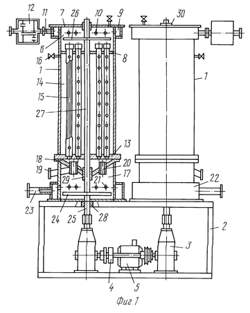 Способ разделения жидкостей и устройство для его осуществления относятся к мембранной технологии очистки, концентрирования и разделения жидких сред и могут использоваться в машиностроительной, пищевой, химической, фармацевтической и других отраслях промышленности. Устройство для разделения включает два аппарата, раму, два соединенных общим валом вибровозбудителя, штоки которых снабжены двумя поршнями, размещенными, соответственно, в приемной и отводящей камерах. Способ разделения включает регенерацию цилиндрических фильтроэлементов низкочастотными акустическими колебаниями, возбуждаемыми с частотой, равной собственной частоте колебаний системы "приемная камера - полости фильтроэлементов - отводящая камера" в двух параллельных потоках с изменением угла сдвига фаз до 180o . 1