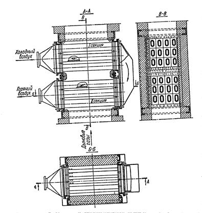 У цьому рекуператорі тепло від продуктів згоряння до повітря передається трьома способами: випромінюванням продуктів згоряння із внутрішньої сторони пучка труб; конвекцією й випромінюванням продуктів згоряння при проходженні ними через пучки труб і прямим випромінюванням продуктів згоряння й кладки із зовнішньої сторони пучка труб.
